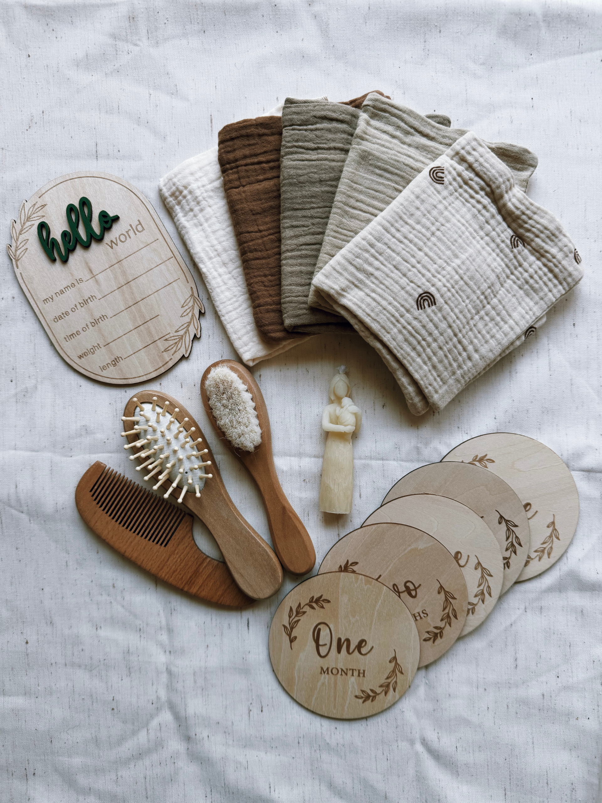 • Wooden baby brush + comb set – handcrafted with gentle goats hair bristles.