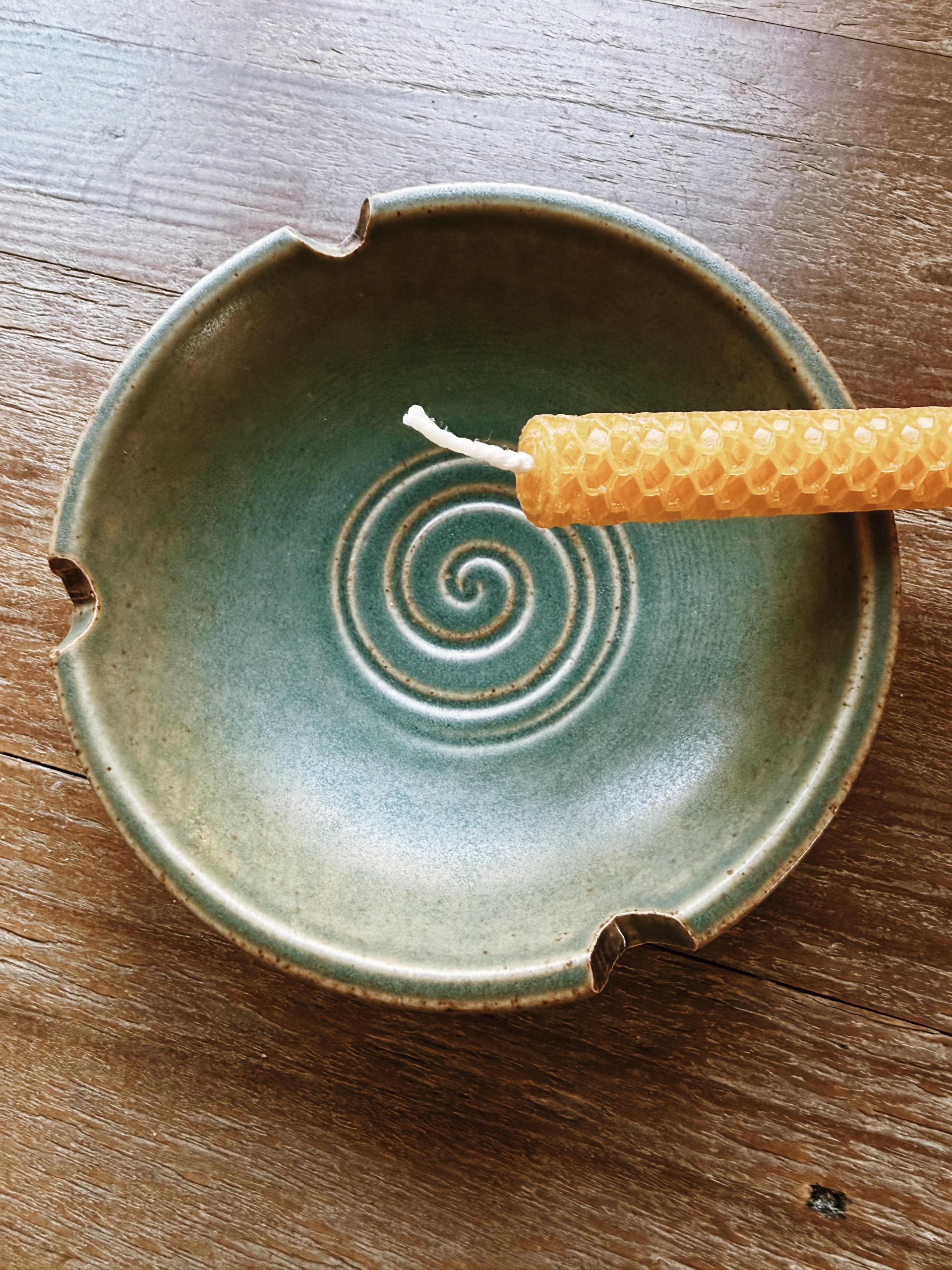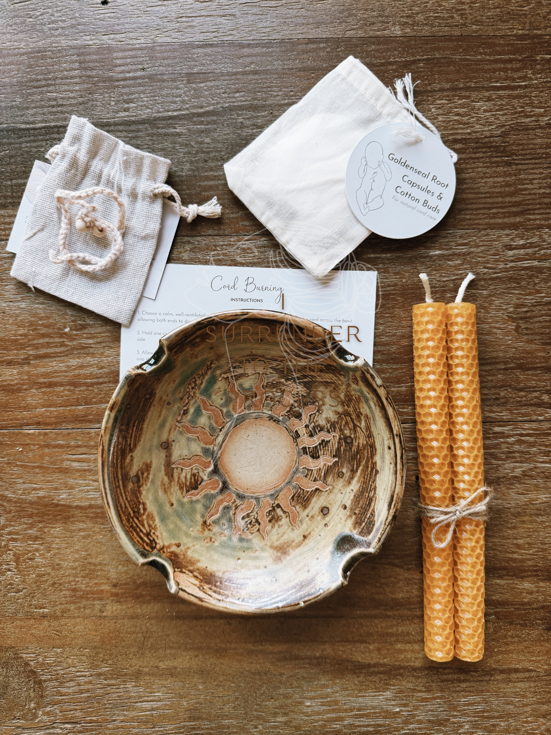 Designed with purpose, symbolism, and earthy beauty, The Sunstone Cord Burning Bowl offers families a meaningful and gentle way to separate their baby’s umbilical cord. The bowl has been intentionally crafted for cord burning, featuring four notches to hold taper candles securely and an etched sun motif representing warmth, vitality, and new beginnings.