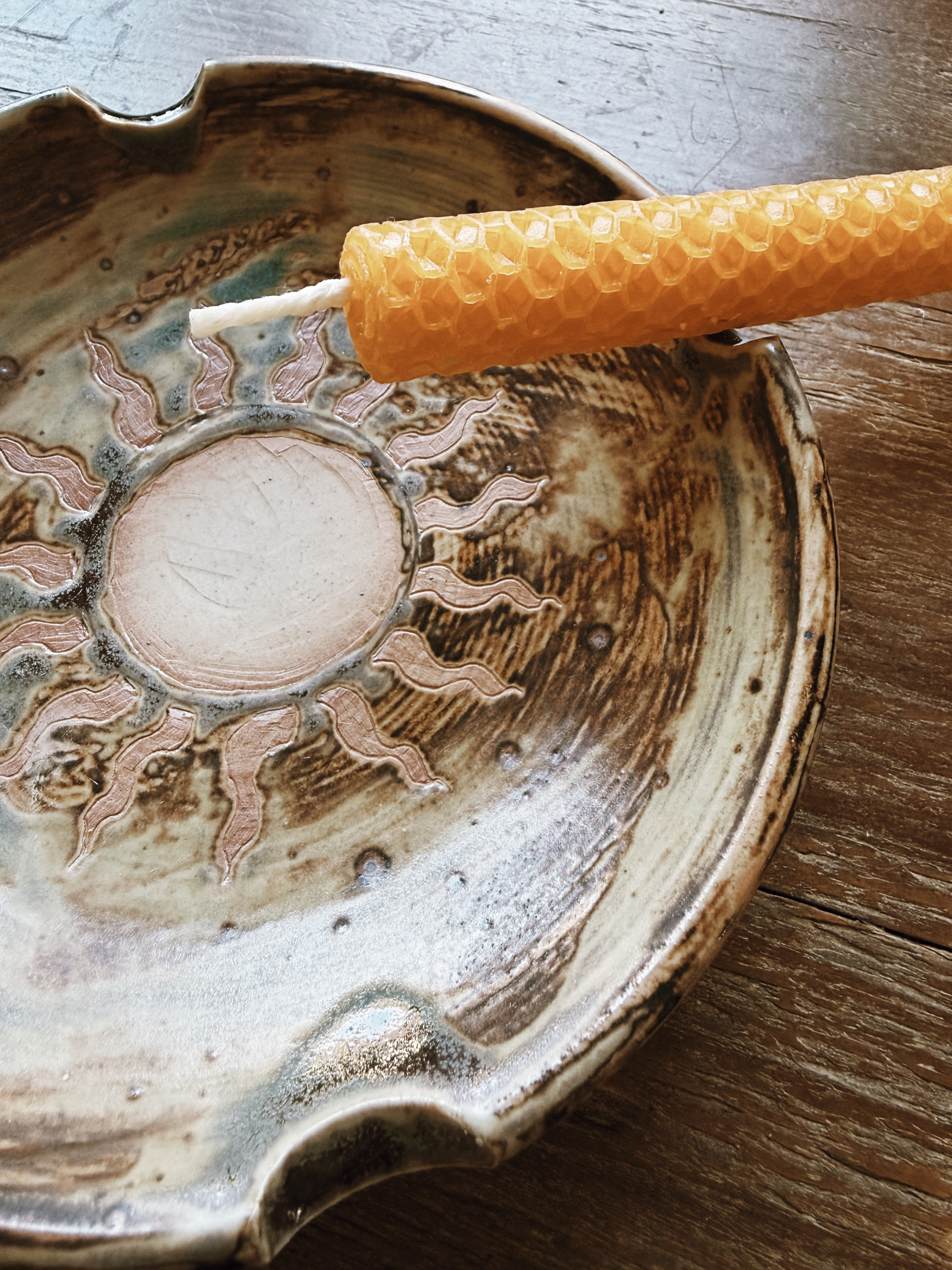 Handcrafted Sunstone Cord Burning Bowl: with four notches and an etched sun design