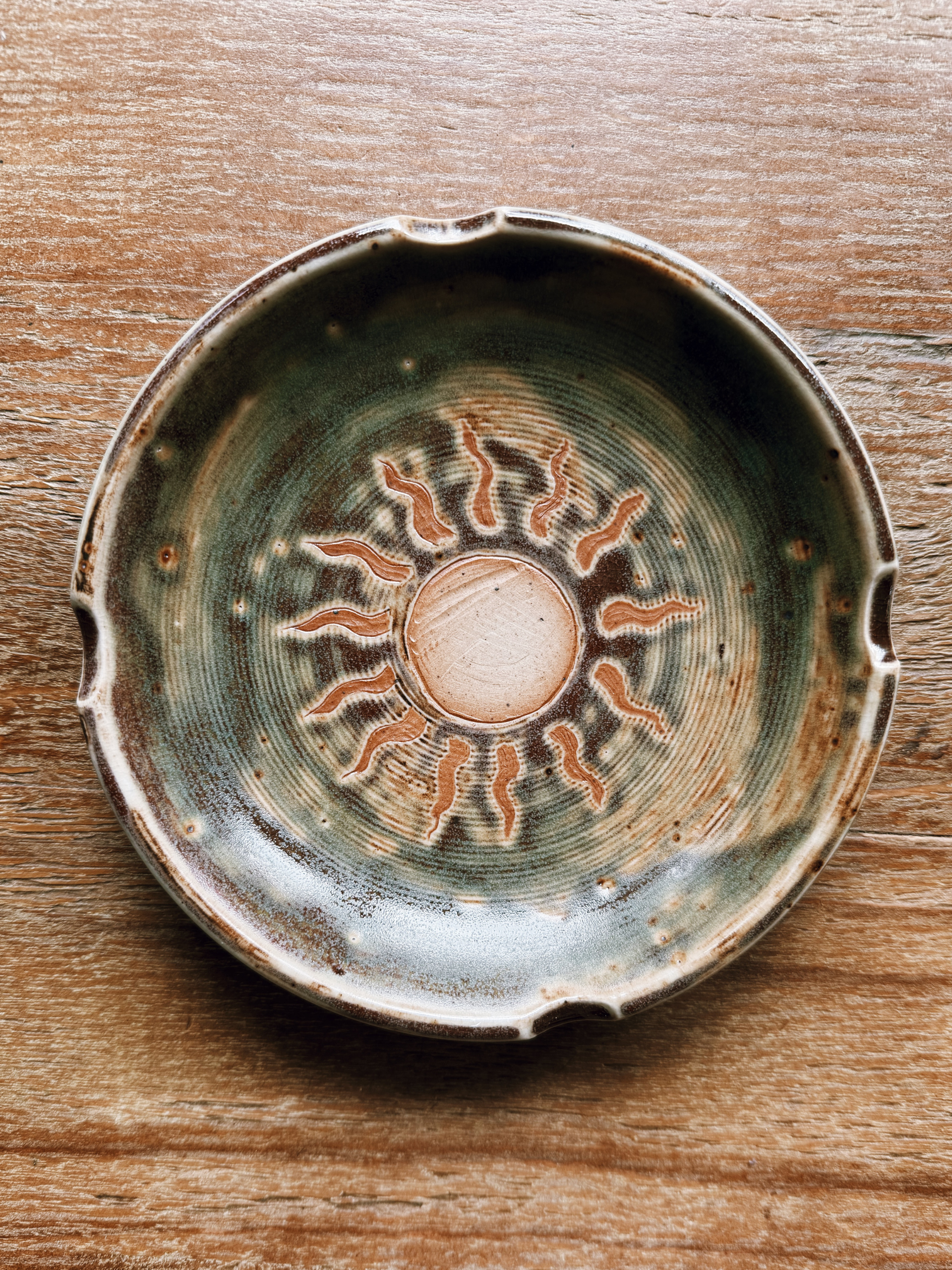 • Handcrafted Sunstone Cord Burning Bowl: with four notches and an etched sun design